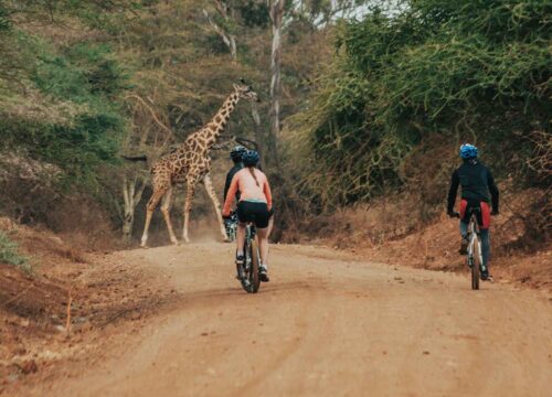As we get closer to the park, we may be lucky enough to spot giraffes grazing along the route. Once we reach the park entrance gate, we’ll complete the necessary paperwork and hop into a car for a short game drive around the park, taking in the sights of the beautiful Momella lakes. After the game drive, we’ll return to the main gate, collect our bikes, and continue our ride towards the Ngongongare gate, marking the end of our cycling for today.