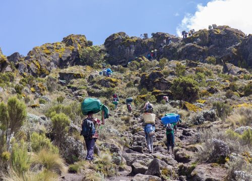 Our day starts with a descent into a ravine towards the foot of the Great Barranco Wall. Subsequently, we ascend the nearly 900-ft cliff, which, though non-technical, is steep. After conquering the Barranco Wall, we traverse a sequence of hills and valleys until we sharply descend into Karanga Valley. Another steep ascent brings us to Karanga Camp. Designed for acclimatization, this is a shorter day's journey.