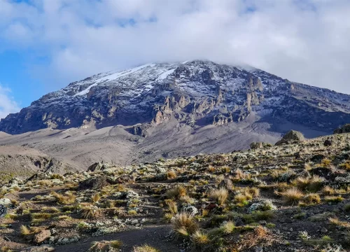 Departing from Karanga, we reach the intersection linking to the Mweka Trail. Proceeding onwards, we ascend through the rocky terrain toward Barafu Hut. Upon reaching this juncture, you've traversed the Southern Circuit, providing panoramic views of the summit from various perspectives. Here, we establish camp, rejuvenate, and partake in an early dinner in readiness for summit day. The towering peaks of Mawenzi and Kibo are visible from this vantage point.