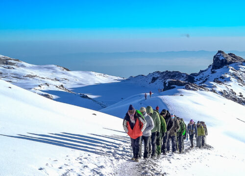 Start the trek to Uhuru Peak at midnight, climbing the most challenging part of the trail in the dark. After reaching Stella Point (5,739m), you continue to Uhuru Peak (5,895m), the highest point in Africa. Take in the sunrise and the feeling of accomplishment. After photos and a short celebration, descend to Mweka Camp for some well-deserved rest.